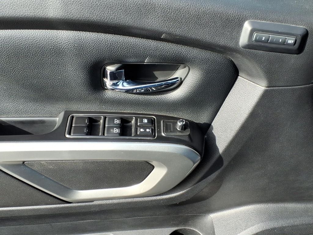 12 Speakers, 3.916 Axle Ratio, 4-Wheel Disc Brakes, ABS brakes, Activation Disclaimer, Air Conditioning, Alloy wheels, AM/FM radio: SiriusXM, Auto tilt-away steering wheel, Auto-dimming door mirrors, Auto-dimming Rear-View mirror, Automatic temperature control, Block heater, Brake assist, Bumpers: chrome, CD player, Chrome Exhaust Finisher, Chrome Grille, Compass, Delay-off headlights, Driver door bin, Driver vanity mirror, Dual front impact airbags, Dual front side impact airbags, Electronic Stability Control, Emergency communication system, Front anti-roll bar, Front Bucket Seats, Front Center Armrest, Front dual zone A/C, Front fog lights, Front reading lights, Front wheel independent suspension, Garage door transmitter: HomeLink, Heated Captain's Chairs, Heated door mirrors, Heated front seats, Illuminated entry, Leather Seat Trim, Leather steering wheel, LED Fog Lights w/Bright Chrome Bezel, Low tire pressure warning, Memory seat, Metallic Kick Plates, Navigation System, Outside temperature display, Overhead airbag, Overhead console, Panic alarm, Passenger door bin, Passenger vanity mirror, Power door mirrors, Power driver seat, Power passenger seat, Power steering, Power windows, Radio data system, Radio: NissanConnect w/Navigation & Mobile Apps, Rain sensing wipers, Rear anti-roll bar, Rear Bumper Step, Rear seat center armrest, Rear Seat Storage Compartment w/Luggage Floor, Rear step bumper, Rear window defroster, Remote keyless entry, Rockford Fosgate Premium Audio w/12 Speakers, Running Boards, Security system, Speed control, Speed-sensing steering, Speed-Sensitive Wipers, Splash Guards (B93), Split folding rear seat, Steering wheel memory, Steering wheel mounted audio controls, Tachometer, Telescoping steering wheel, Texas TITAN Edition, Texas TITAN Floor Mats (B09), Tilt steering wheel, Traction control, Turn signal indicator mirrors, Variably intermittent wipers, Voltmeter, Wheels: 20 x 7.5 Chrome, Wheels: 20 x 7.5 Painted Alloy.