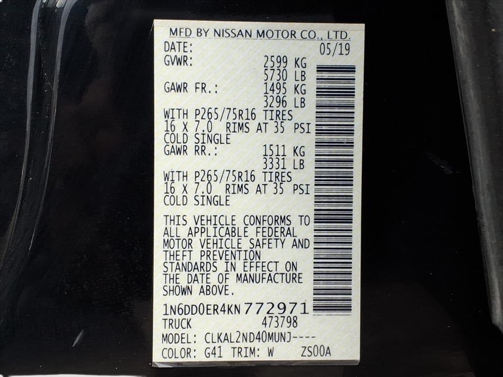 16 Off-Road Design Alloy Wheels, 3.133 Axle Ratio, 4-Wheel Disc Brakes, 6 Speakers, ABS brakes, Air Conditioning, Alloy wheels, AM/FM radio, Anti-whiplash front head restraints, Bed-Liner / Truck Bed Mat / Cargo Liner, Below Market Value, Bluetooth® Hands Free Phone System, Bumpers: body-color, Check out this 2019 Nissan Frontier in Magnetic Black Pearl with Steel Cloth, Driver door bin, Driver vanity mirror, Dual front impact airbags, Dual front side impact airbags, Electronic Stability Control, Exterior Parking Camera Rear, Floor Mats, Front anti-roll bar, Front Bucket Seats, Front Center Armrest, Front fog lights, Front reading lights, Front wheel independent suspension, Great MPG, Illuminated entry, Low Monthly Payment, Low tire pressure warning, No Money Down / $0 Down, Occupant sensing airbag, Overhead airbag, Overhead console, Panic alarm, Passenger door bin, Passenger vanity mirror, Power door mirrors, Power steering, Power windows, Radio data system, Radio: AM/FM w/Auxiliary, Rear step bumper, Rear-View Back up Camera, Remote keyless entry, Speed control, Speed-sensing steering, Split folding rear seat, Steering wheel mounted audio controls, Tachometer, Tilt steering wheel, Touch Screen!, Traction control, Trip computer, Unique Cloth Seat Trim, V6 Engine - All the Power!, Variably intermittent wipers, Voltmeter, Work Truck.