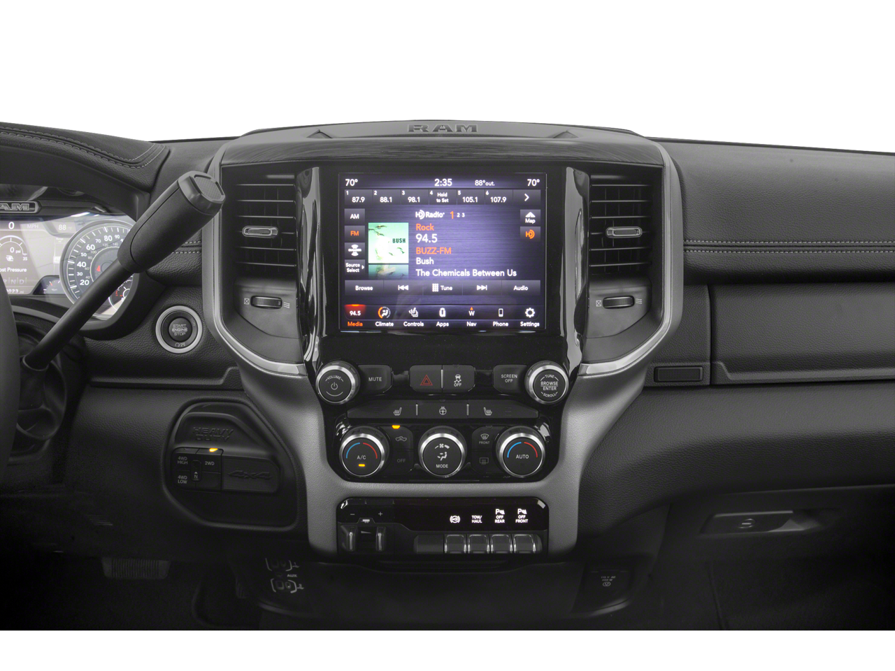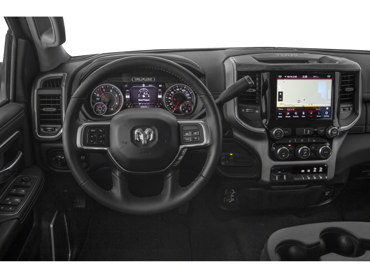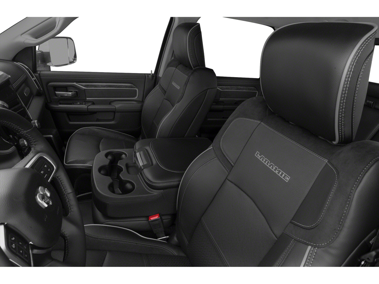 1-Year SiriusXM Guardian Trial, 10 Speakers, 115V Auxiliary Rear Power Outlet, 12 Touchscreen Display, 2 Way Rear Headrest Seat, 220 Amp Alternator, 2nd Row In Floor Storage Bins, 3.73 Axle Ratio, 4 Way Front Headrests, 4-Wheel Disc Brakes, 4G LTE Wi-Fi Hot Spot, 5-Year SiriusXM Traffic Service, 5-Year SiriusXM Travel Link Service, 5th Wheel/Gooseneck Towing Prep Group, 8.4 Touchscreen Display, ABS brakes, Active Noise Control System, Adaptive Steering System, Adjustable pedals, Air Conditioning, Alloy wheels, AM/FM radio: SiriusXM, Anti-Spin Differential Rear Axle, Apple CarPlay, Apple CarPlay/Android Auto, Auto High Beam Headlamp Control, Auto-dimming Rear-View mirror, Automatic temperature control, Bed Utility Group, Black Exterior Mirrors, Black Exterior Truck Badging, Black Headlamp Bezels, Black Interior Accents, Black Ram Head Tailgate Badge, Black Tail Lamp Bezels, Black Wheel Center Hub, Blind Spot & Cross Path Detection (DISC), Body Color Door Handles, Body Color Grille Surround, Brake assist, Bumpers: chrome, Clearance Lamps, Compass, CTR Stop Lamp w/Cargo View Camera, Delay-off headlights, Disassociated Touchscreen Display, Driver door bin, Driver vanity mirror, Dual front impact airbags, Dual front side impact airbags, Electronic Stability Control, Electronically Controlled Throttle, Exterior Mirrors w/Memory, Foam Bottle Insert (Door Trim Panel), For Details Visit DriveUconnect.com, Front anti-roll bar, Front Center Armrest w/Storage, Front dual zone A/C, Front fog lights, Front License Plate Bracket, Front reading lights, Front Seat Back Map Pockets, Fully automatic headlights, Garage door transmitter, Gloss Black Grille Billets/Accents, Google Android Auto, GPS Antenna Input, GPS Navigation, HD Radio, Heated door mirrors, Heated Front Seats, Heated front seats, Heated Steering Wheel, Heated steering wheel, Heavy Duty Snow Plow Prep Group, Illuminated entry, Integrated Center Stack Radio, Integrated Voice Command w/Bluetooth®, Laramie Level 1 Equipment Group (DISC), Leather steering wheel, Leather Trim 40/20/40 Bench Seat, LED Bed Lighting, Low tire pressure warning, Manufacturer's Statement of Origin, Mirror-Mounted Aux Reverse Lamps, MOPAR Deployable Bed Step, MOPAR Front & Rear Rubber Floor Mats, MOPAR Spray In Bedliner, Night Edition, Occupant sensing airbag, Outside temperature display, Overhead airbag, Overhead console, Painted Front Bumper, Painted Rear Bumper, Panic alarm, ParkView Rear Back-Up Camera, Passenger door bin, Passenger vanity mirror, Power 2-Way Driver Lumbar Adjust, Power 2-Way Passenger Lumbar Adjust, Power Adjust 8-Way Driver Seat, Power Adjust 8-Way Front Passenger Seat, Power Adjustable Convex Aux Mirrors, Power Adjustable Pedals w/Memory, Power Black Tow Mirrors w/Convex Spotter & Memory, Power Chrome Tow Mirrors w/Convex Spotter & Memory, Power door mirrors, Power driver seat, Power passenger seat, Power steering, Power windows, Quick Order Package 2HH Laramie, Radio data system, Radio: Uconnect 12.0 w/Navigation, Radio: Uconnect 4 w/8.4 Display, Radio/Driver Seat/Mirrors/Pedals Memory, Rain Sensitive Windshield Wipers, Rear 60/40 Folding Seat, Rear anti-roll bar, Rear reading lights, Rear seat center armrest, Rear step bumper, Rear window defroster, Remote keyless entry, Remote Tailgate Release, Security system, SiriusXM Satellite Radio, SiriusXM Traffic Plus, SiriusXM Travel Link, SiriusXM w/360L, Speed control, Split folding rear seat, Steering wheel mounted audio controls, Surround View Camera System, Tachometer, Tilt steering wheel, Tip Start, Tow Hooks, Towing Technology Group (DISC), Traction control, Trailer Reverse Guidance, Trip computer, Turn signal indicator mirrors, Variably intermittent wipers, Vendor Painted Cargo Box Tracking, Ventilated Front Seats, Voltmeter, Wheels: 18 x 8.0 Polished Aluminum, Wheels: 20 x 8.0 Black Pai